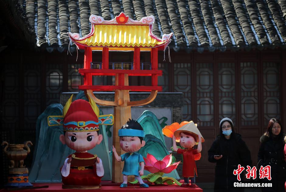 1月26日,南京夫子庙大成殿内,游客从刚刚安装好的大型彩灯前经过。随着春节临近,民间灯彩艺人开始在夫子庙一带加紧安装大型灯组、扎制各式花灯,为节日“盛装打扮”。中新社记者 泱波 摄