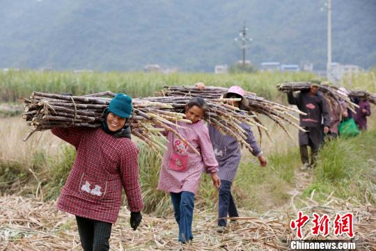 1月26日,在广西柳州市融安县浮石镇谏村,蔗农将砍收好的甘蔗扛出田地。 谭凯兴 摄