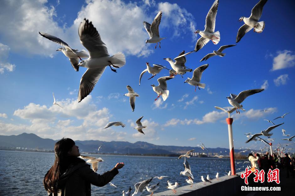 市民来到海埂大坝享受久违的暖阳。 中新社记者 刘冉阳 摄