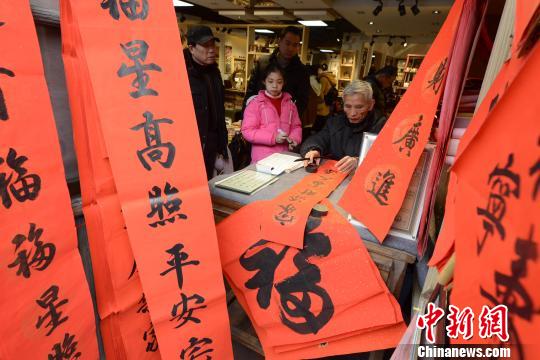 一民间书法家在福州三坊七巷手书春联受市民喜爱。 刘可耕 摄