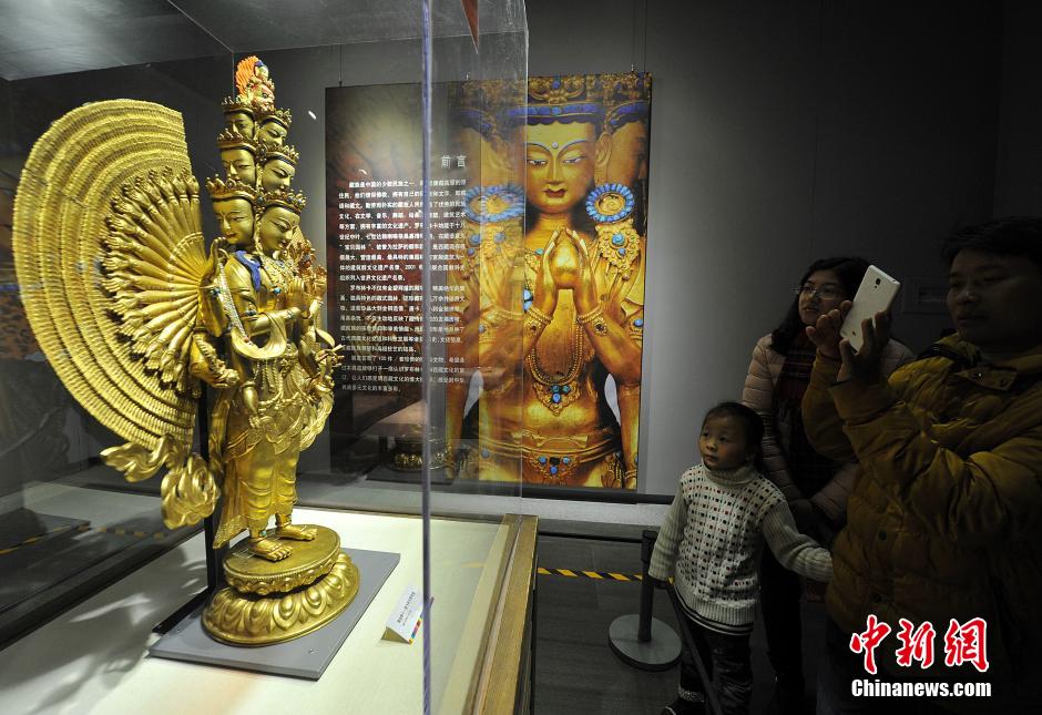 清代镀金铜十一面千手千眼观音吸引了许多前来观展民众的眼球。据了解,佛教造像作为藏传佛教艺术的主要部分,以其历史悠久、风格多样、别具异彩著称于世。 中新社记者 张斌 摄