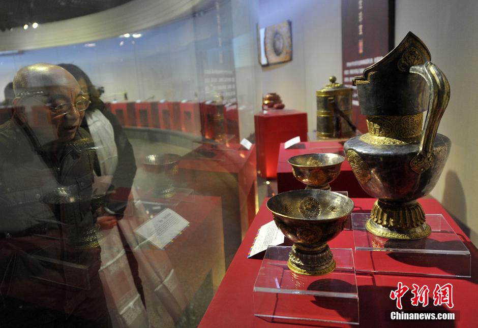 民众在参观展出的历代高僧起居礼佛、处理政务的生活用品、陈设家具、服装饰物等文物。 中新社记者 张斌 摄