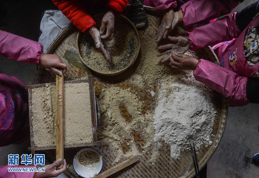 1月27日,湖州市吴兴区星火村村民在家中用番薯粉和米粉制作传统的番薯米糕。新华社记者 徐昱 摄