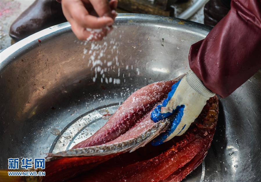 1月27日,湖州市吴兴区幻溇村47岁村民钮新珍给鱼身上撒盐,制作太湖鱼干。新华社记者 徐昱 摄