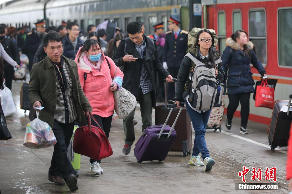 1月27日,带着行李的旅客们在南京火车站乘坐火车。随着春节的日益临近,越来越多的旅客踏上返乡的旅程。 中新社记者 泱波 摄