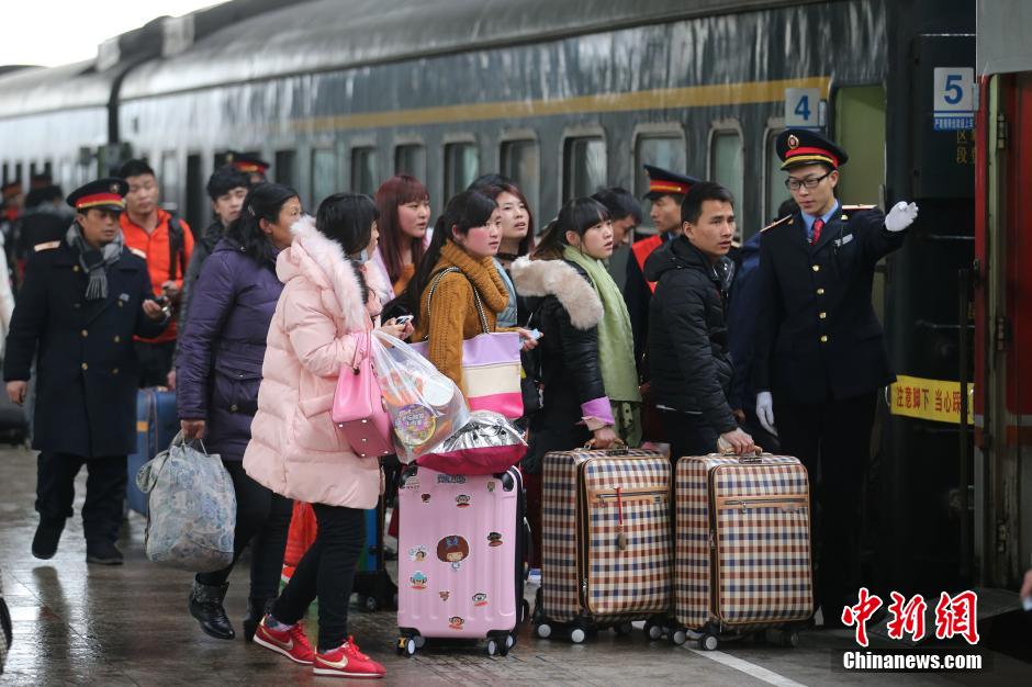 1月27日,带着行李的旅客们在南京火车站乘坐火车。随着春节的日益临近,越来越多的旅客踏上返乡的旅程。 中新社记者 泱波 摄
