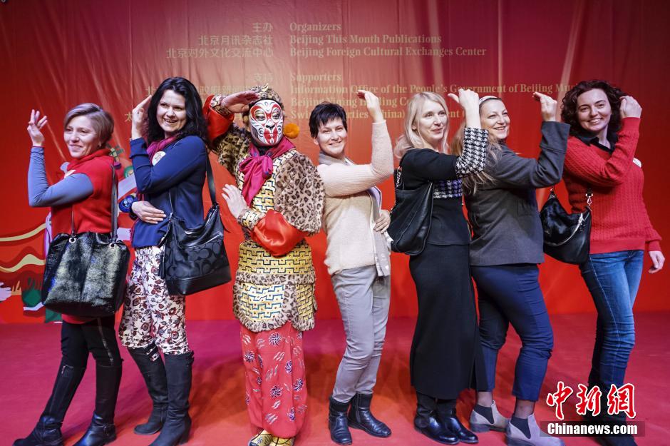 1月27日,京剧演员与外国友人们合影留念。“北京沙龙·亲历北京”之“亲历中国春节文化”活动在北京太古里红馆举办。活动邀请在京境外人士观看中国传统曲艺节目,同时外国留学生们也为观众带来了精彩表演。 中新社记者 熊然 摄