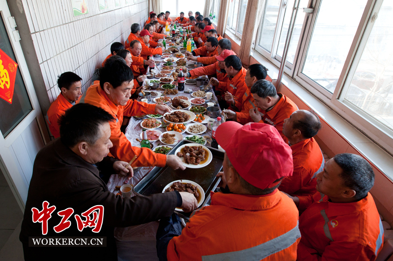 2016年1月28日,北京市西城区德胜街道工委书记马红萍、街道办事处主任岳立、街道总工会主席陈洪祥以及街道相关部门负责人来到德胜保洁队,与春节期间无法回家过年的70名保洁队员一起包饺子,并同吃饺子宴,提前过小年。 中工网记者 李雪峰 摄