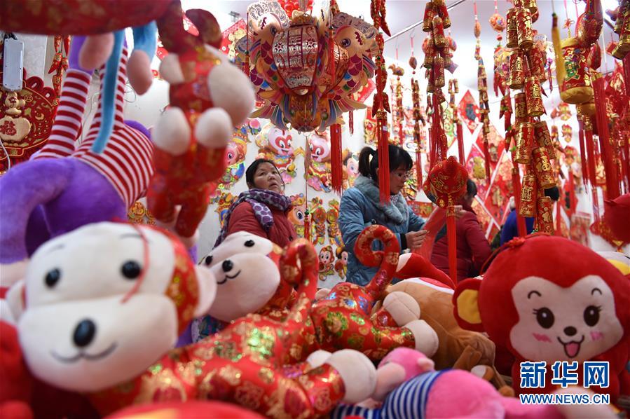 1月28日,安徽合肥市城隍庙小商品市场内迎接猴年的饰品琳琅满目。近日,合肥各小商品市场以“猴”为主题的年节饰品销售火爆。人们购买喜庆的猴年饰品,迎接新春佳节的到来。 新华社发(杨晓原 摄)