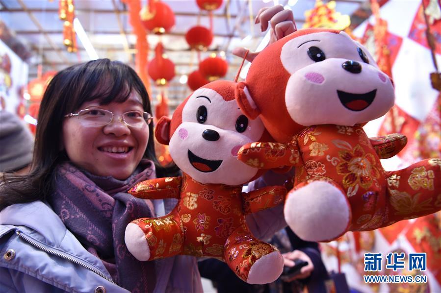 1月28日,消费者在安徽合肥市城隍庙小商品市场购买猴年饰品。近日,合肥各小商品市场以“猴”为主题的年节饰品销售火爆。人们购买喜庆的猴年饰品,迎接新春佳节的到来。 新华社发(杨晓原 摄)
