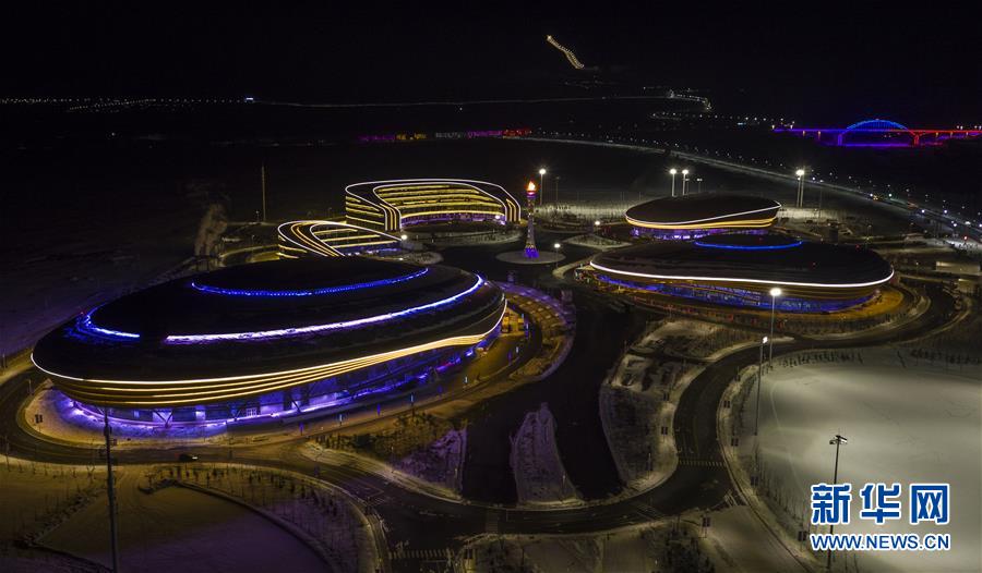 1月27日,第十三届全国冬运会冰上比赛项目继续在位于天山脚下的新疆冰上运动中心举行。新疆冰上运动中心场馆由速滑馆、冰球馆、冰壶馆、媒体中心及组委会、餐厅、宿舍和动力中心组成,从空中看,像一朵盛开的雪莲花,燃烧的火炬处在花蕊的位置。这是北京时间1月27日夜晚在乌鲁木齐上空拍摄的“雪莲花”全景。 新华社记者江文耀摄