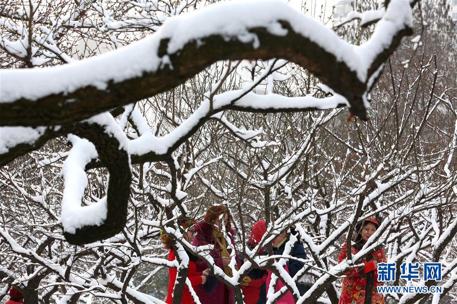 2月1日,游人在南京古林公园雪中赏梅。 1月31日下午至2月1日凌晨,江苏南京出现降雪天气。南京古林公园的梅花被雪覆盖,吸引游人踏雪寻梅。 新华社发(王新 摄)