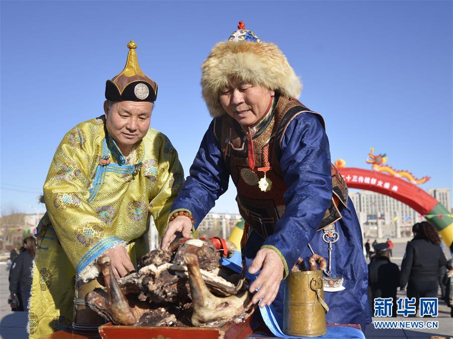 2月1日,身穿蒙古族服饰的牧民在内蒙古巴彦淖尔市乌拉特中旗祭火迎春仪式上摆放供品。当日是农历小年,内蒙古乌拉特中旗周边牧民和社会各界群众欢聚哈萨尔广场,举行传统祭火仪式,祈盼草原风调雨顺,国泰民安。 新华社发(支茂盛摄)