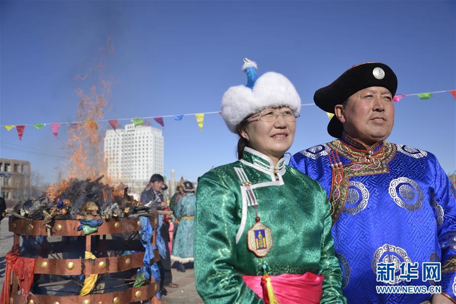 2月1日,一对蒙古族夫妇在内蒙古巴彦淖尔市乌拉特中旗祭火迎春仪式上留影。当日是农历小年,内蒙古乌拉特中旗周边牧民和社会各界群众欢聚哈萨尔广场,举行传统祭火仪式,祈盼草原风调雨顺,国泰民安。 新华社发(支茂盛摄)