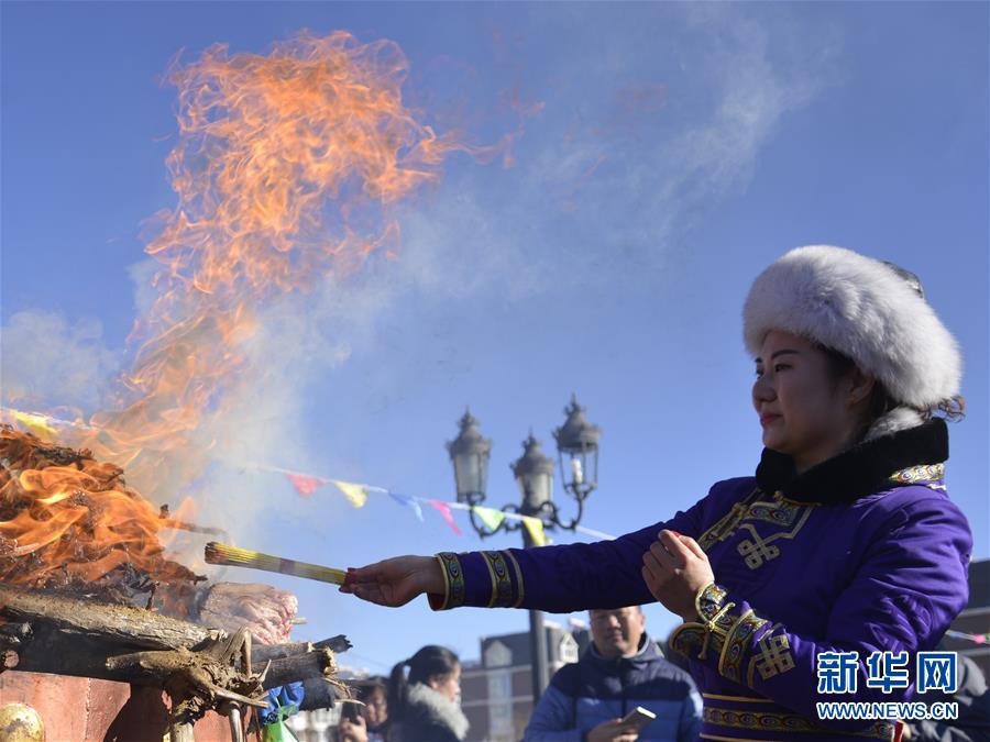 2月1日,身穿蒙古族服饰的牧民在内蒙古巴彦淖尔市乌拉特中旗祭火迎春仪式上祈福。当日是农历小年,内蒙古乌拉特中旗周边牧民和社会各界群众欢聚哈萨尔广场,举行传统祭火仪式,祈盼草原风调雨顺,国泰民安。 新华社发(支茂盛摄)