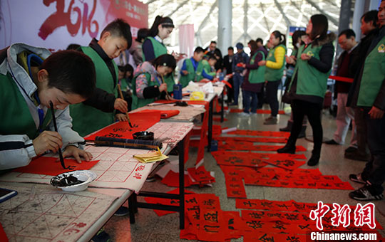 小朋友在书写春联。 中新社记者 汤彦俊 摄