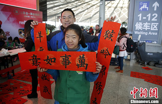 2月1日,一群爱好书法的小朋友在上海火车南站,自发为返乡过年的旅客写春联送祝福。