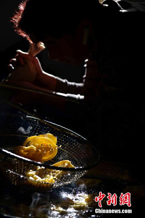 图为2月1日,工人从锅中捞出刚炸好的卡塞。 李林 摄