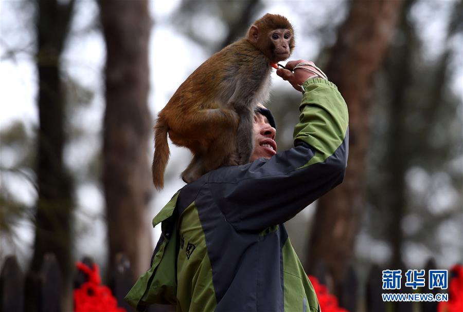 2月1日,一只小猴在驯养员肩头“嬉戏”。为喜迎即将到来的农历猴年,云南野生动物园举行“萌猴”迎“猴年”活动,让动物园的猴子与游客近距离接触。 新华社记者 蔺以光 摄
