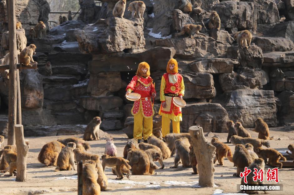 2月2日,郑州动物园的饲养员扮成大圣,为郑州动物园上百只猴子举办了一次“宴会”,为它们提供干果、水果和蔬菜等食物,都是它们的最爱。王中举 摄