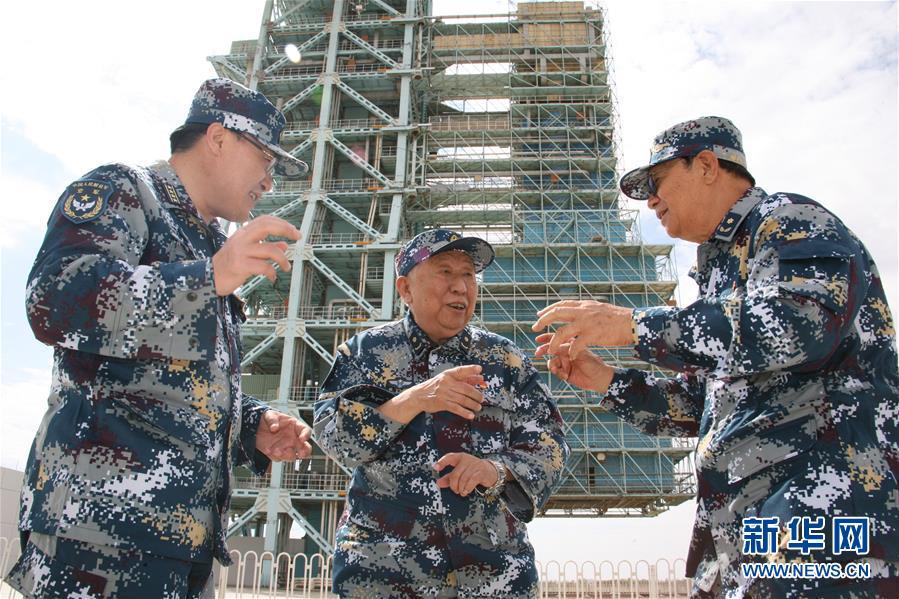 2009年6月18日,阎肃和作曲家羊鸣(右一)、时任空政文工团副团长张天宇(左一)在甘肃酒泉卫星发射中心参观时,一起高歌《我爱祖国的蓝天》。 郭幸福 摄 图片来源:新华网