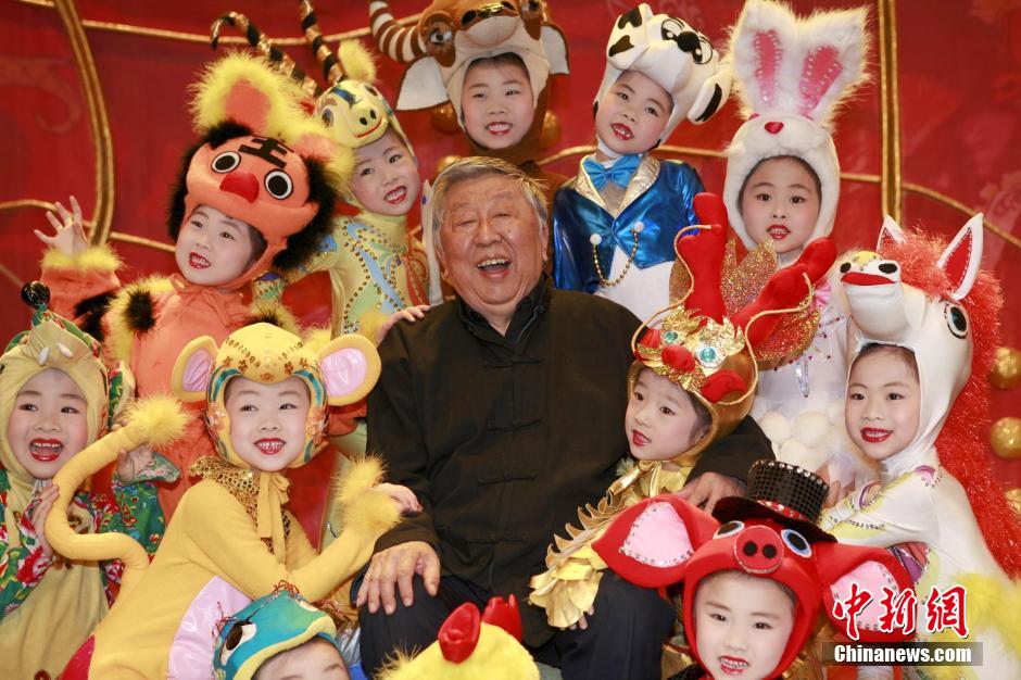 图为2008年5月29日,“六一”儿童节前夕,北京蓝天幼儿艺术团推出大型现代幼儿歌舞情景故事《一家亲》,在北京保利剧院面向社会义演,献给地震灾区的孩子和向灾区献出爱心的人们。著名词作家阎肃与小演员合影。 中新社记者 郭幸福 摄