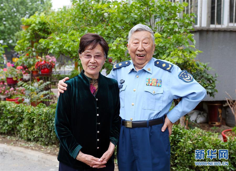 85岁的阎肃在家门口的小花园和老伴李文辉合影留念(2015年5月9日摄)。 郭幸福 摄