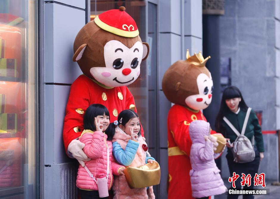 2月11日,北京前门大街的商家装扮成可爱的猴子模样,在春节期间吸引来北京旅游的顾客光临。 中新社记者 杜洋 摄