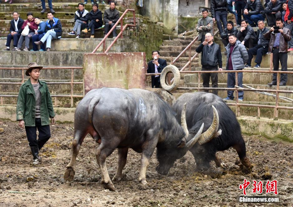 2月11日,在广西三江侗族自治县侗乡鸟巢竞技场内,十多头斗牛为夺“牛王”称号,展开激烈打斗,吸引众多游客前来观赏拍摄。侗族斗牛已有数百年历史,逢年过节均会举办斗牛比赛,以此传承和展示侗族同胞勤劳勇敢、永不服输的民族精神。 龚普康 摄