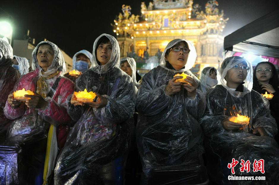 2月11日,台湾高雄地震第6天,有慈善团体晚上在位于维冠大楼倒塌现场附近的天公庙广场举办“安心祈福会”,祈愿共聚善念、走出伤痛,为受灾乡亲祝福,也为台南祈福。 中新社记者 谭达明 摄