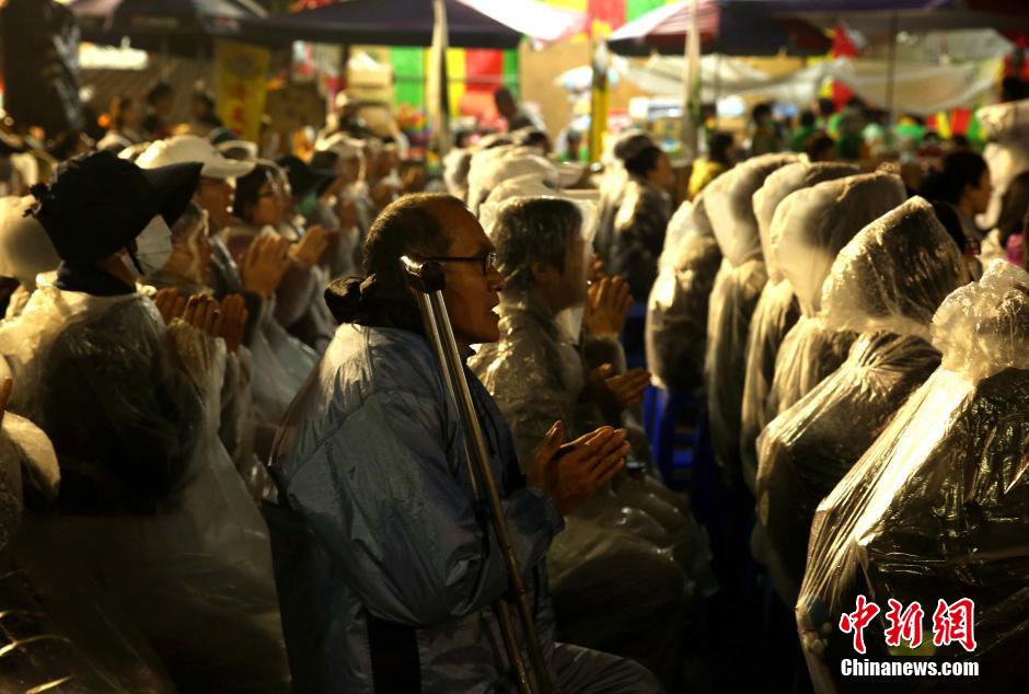 2月11日,台湾高雄地震第6天,有慈善团体晚上在位于维冠大楼倒塌现场附近的天公庙广场举办“安心祈福会”,祈愿共聚善念、走出伤痛,为受灾乡亲祝福,也为台南祈福。图为当晚有宗教团体组织祈福会,民众现场冒雨祈福。 中新社记者 陈悦 摄