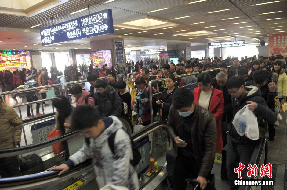 2月12日,武昌火车站,旅客进站上车。当日是正月初五,随着春节假期接近尾声,探亲、旅游的人们陆续返程,中国各地迎来返程客流高峰。 中新社记者 张畅 摄