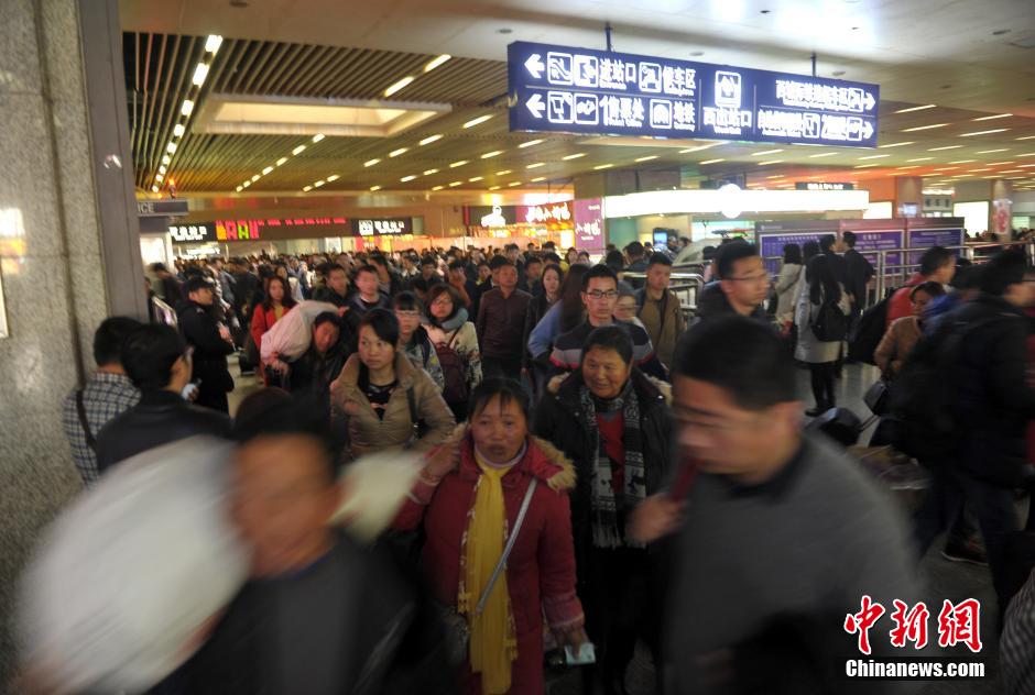 2月12日,武昌火车站,旅客进站上车。当日是正月初五,随着春节假期接近尾声,探亲、旅游的人们陆续返程,中国各地迎来返程客流高峰。 中新社记者 张畅 摄