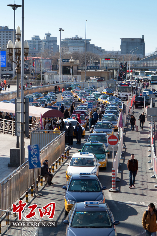 北京站出租车载客区排起长龙。 中工网记者 李雪峰 摄