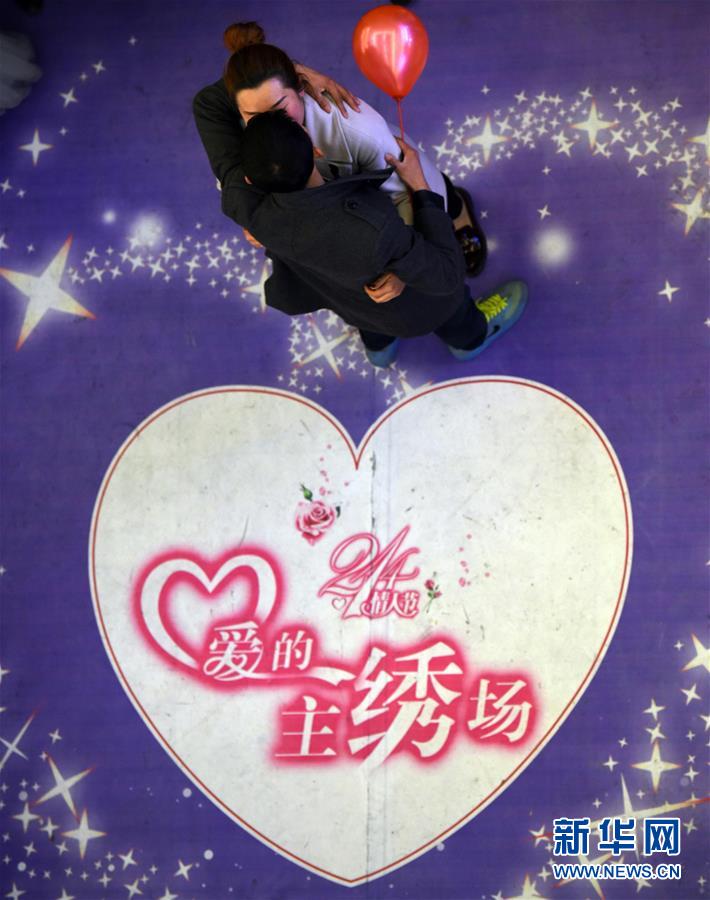 2月14日,在江苏淮安的一家商场,一对情侣参加接吻大赛。当日是西方的情人节,各地许多商家举办接吻大赛,吸引不少情侣参加秀甜蜜。 新华社发(贺敬华 摄)