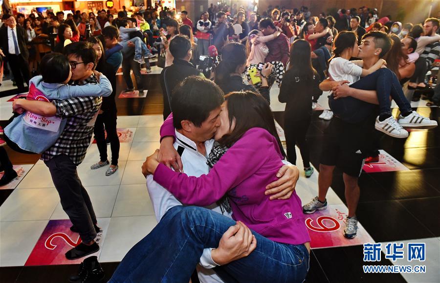 2月14日,情侣在情人节接吻大赛中接吻。当日,台北举行情人节接吻大赛,15对情侣在长吻中度过难忘的情人节。 新华社记者张国俊摄