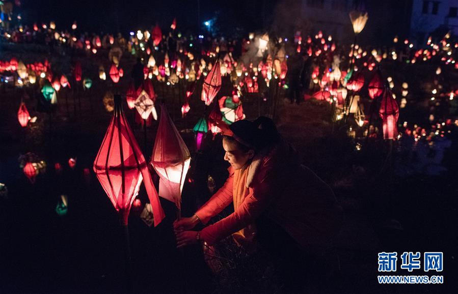 2月21日,在四川省南充市嘉陵区三会镇,“蛴蟆灯”祈福巡游结束后,一女孩将“蛴蟆灯”插入田地里。 2月21日夜幕降临时分,来自四川省南充市嘉陵区三会镇及周边数万名群众,点亮“蛴蟆灯”,敲着锣鼓唱着“送蛴蟆”的歌谣,将“蛴蟆”送到距离场镇几公里外的溪河边去,以祈福健康平安。据介绍,正月十四点“蛴蟆灯”、“送蛴蟆”祈福这一习俗源于清朝年间,已有300多年历史,历经演变成为川东北地区一个古老而神秘的地方民俗节日。新华社记者 江宏景 摄