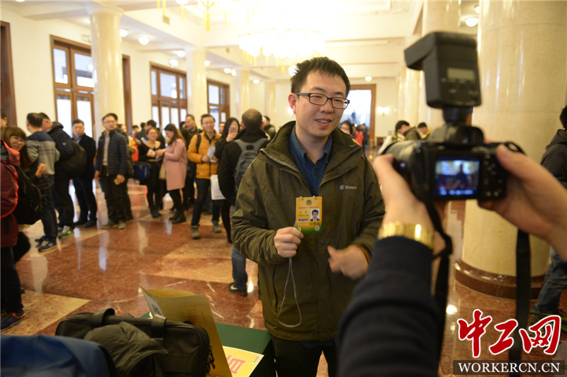 2016年3月1日,全国政协十二届四次会议内地记者情况通报会在全国政协礼堂举行。据悉,参与2016年全国两会报道的记者总人数超过5000人。图为参会记者领取采访证件。工人日报记者 吴凡 摄