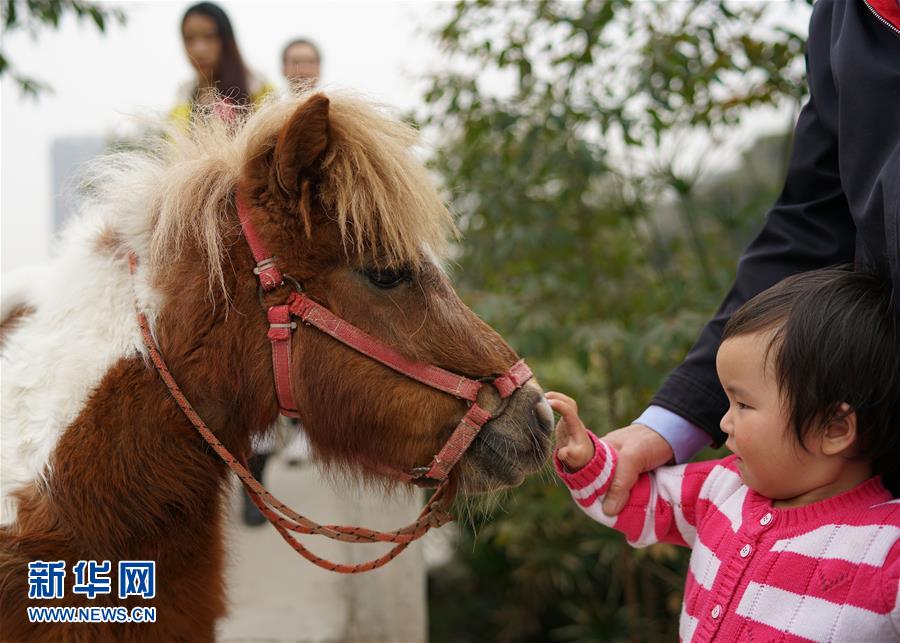 3月2日,小朋友与重庆美心洋人街景区湿地公园内的矮马亲密接触。
