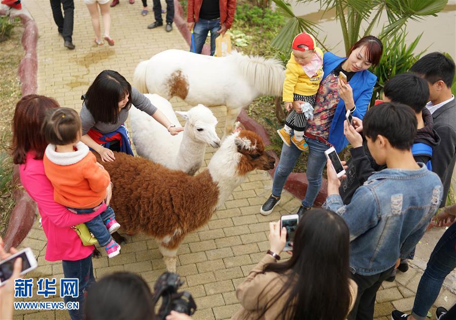 3月2日,市民与重庆美心洋人街景区湿地公园内的羊驼合影。新华社记者 陈诚 摄