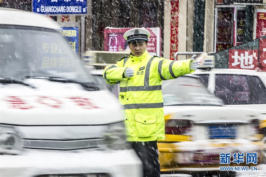 3月2日,在吉林省洮南市,一名交警在雪中指挥交通。当日,吉林省部分地区迎来雨夹雪天气,预计本轮降雨降雪将持续至3月5日。 新华社发(邱会宁 摄)