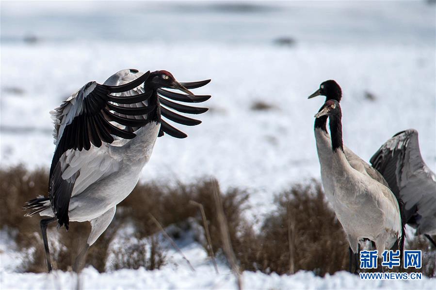 黑颈鹤在大山包大海子湿地嬉戏、觅食(2月26日摄)。