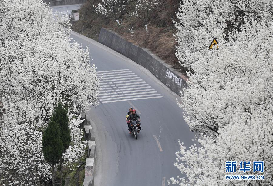 3月2日,薛家湾村公路两旁樱桃花盛开。近日,陕西旬阳县段家河镇薛家湾村连片的樱桃花竞相绽放,形成一道靓丽的风景线。据了解,当地政府根据实际情况,大力发展薛家湾村樱桃种植业,打造生态旅游村。目前该村樱桃年产值980余万元,果农人均年增收5000余元。新华社发(邵瑞 摄)