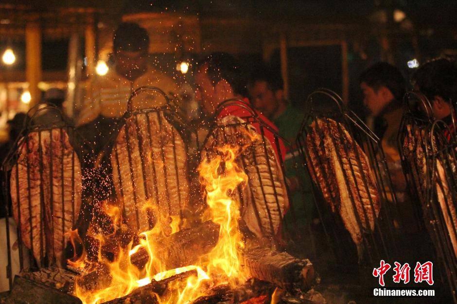 古丝路重镇新疆喀什地区巴楚县夜市一年四季不停歇,每天入夜后,琳琅满目的美食,吸引当地和外地游人品尝美食,休闲聊天。巴楚县城文化路夜市特色美食齐荟萃,人流如织直至凌晨。当地工商部门称,仅文化路夜市经营户最多时达100多家,每天人流过千。巴楚县为新疆南部交通枢纽,商业发达。该县享有“美食之城”的美誉。图为巴楚县有名的烤鱼。中新社记者 王小军 摄