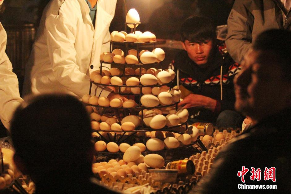 图为游客品尝巴楚县有名的烤鸡蛋、烤鸭蛋、烤鹅蛋、烤鸽子蛋。中新社记者 王小军 摄