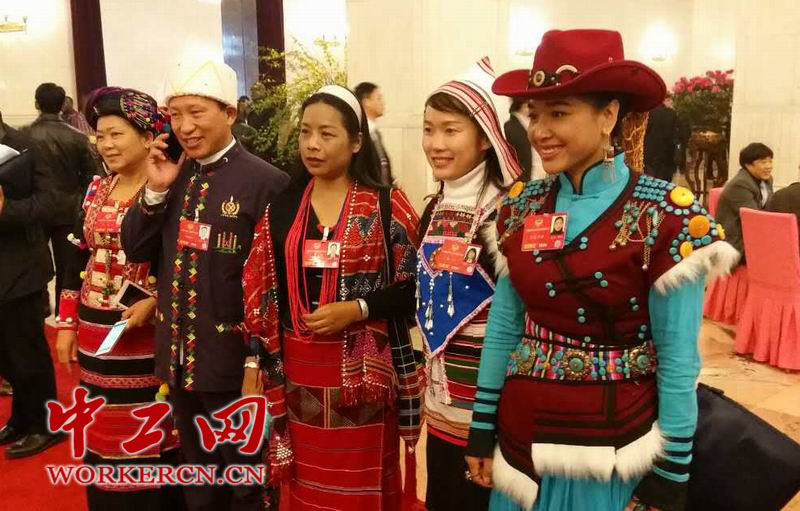 全国政协十二届四次会议开幕会于3月3日下午三时举行,图(右一)为即将参会的普米族政协委员茸芭莘那。中工网记者 刘炳毅 摄