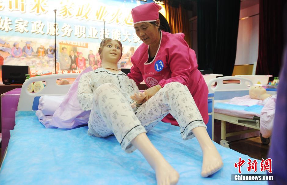 3月3日,来自甘肃14个市州的45名家政职业技能选手,在兰州角逐首届陇原妹家政职业技能大赛。比赛期间,参赛选手分别展示了为婴儿洗澡、照顾生病老人、急救病人等实际操作内容。 中新社记者 杨艳敏 摄