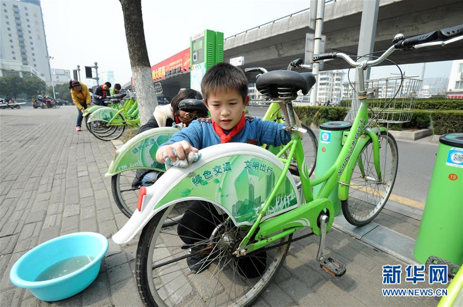 3月3日,江苏省苏州市彩虹小学校的学生在街头清洁公共自行车。