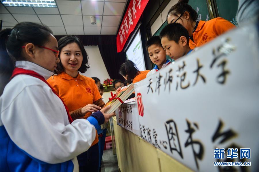 当日,天津师范大学文学院的志愿者将他们筹集的200余册图书捐赠给天津市华夏小学校园图书角,满足学生的课外阅读需求。根据志愿者的调查,在华夏小学就读的学生中有超过一半是外来务工人员子女。新华社发(游思行 摄)
