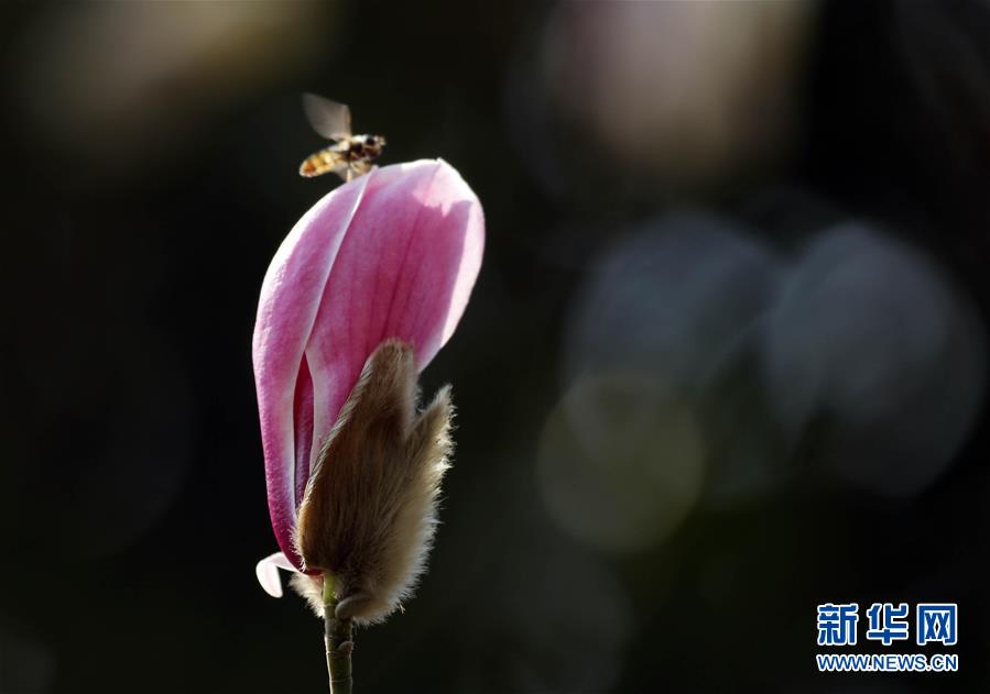 一只蜜蜂在河南省宝丰县一处公园内盛开的玉兰花上停留(2月29日摄)。 新华社发(何五昌 摄)
